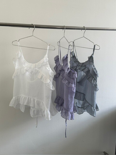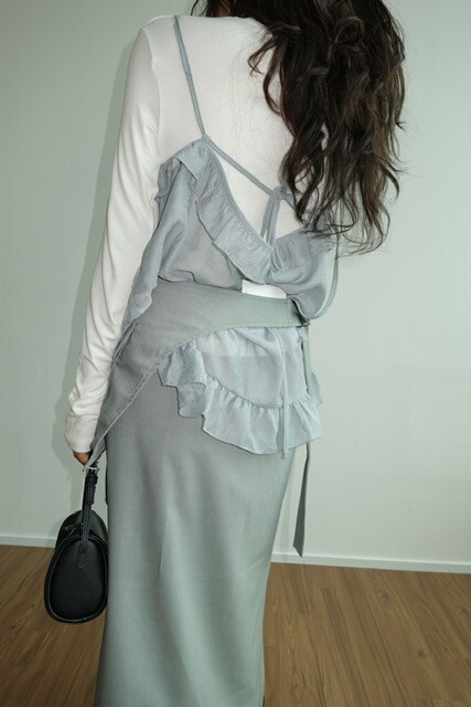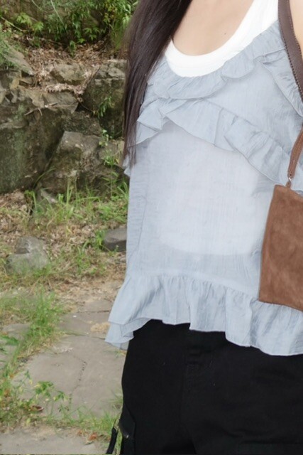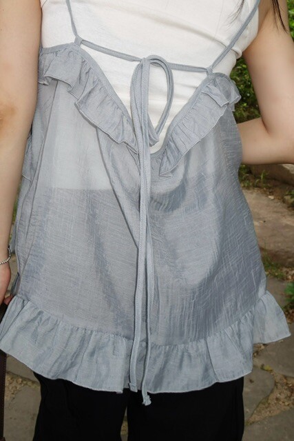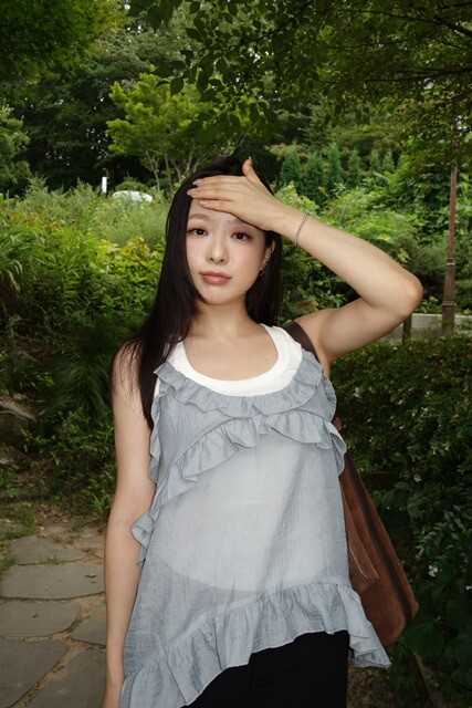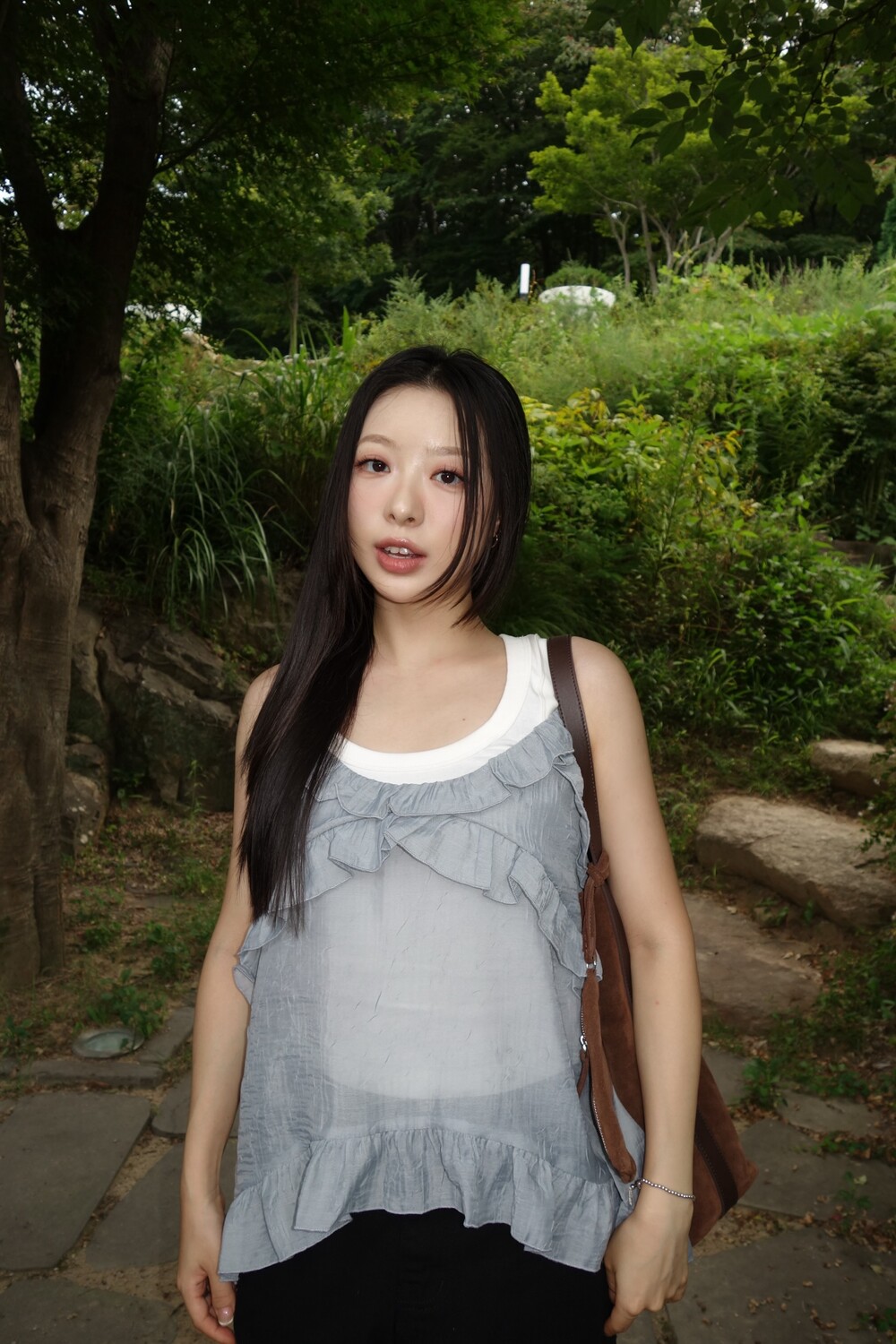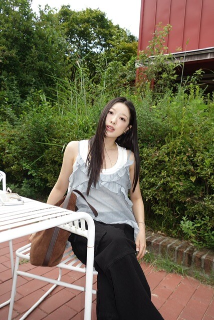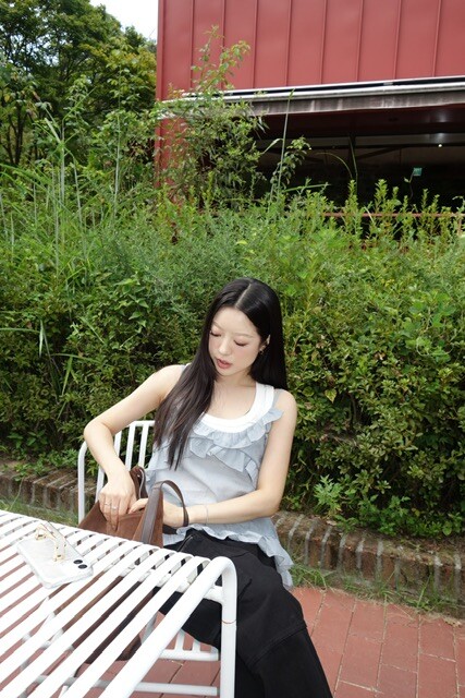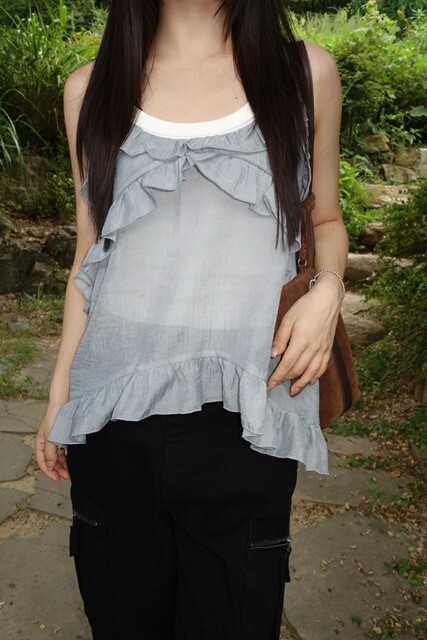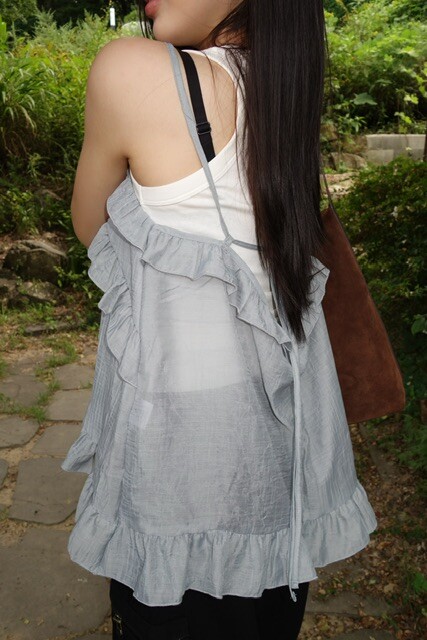 사진 속 프릴 뷔스티에는 가볍고 쉬어한 소재감이 눈에 띄는 아이템이에요.