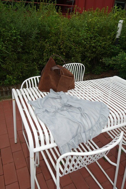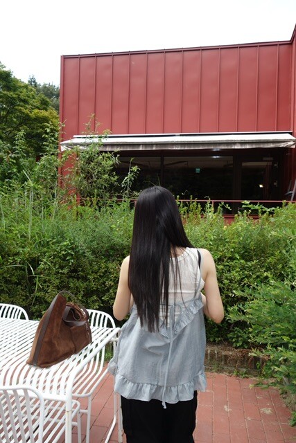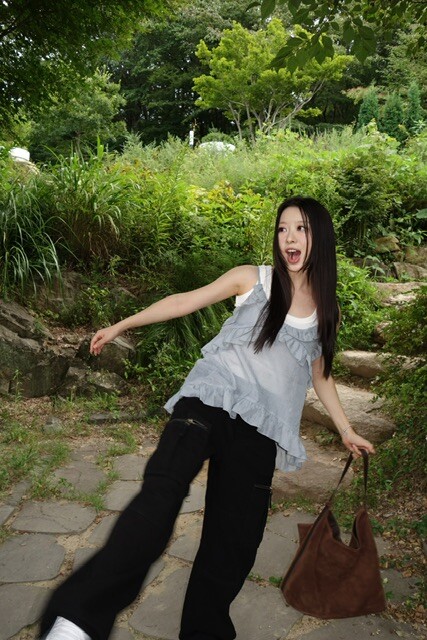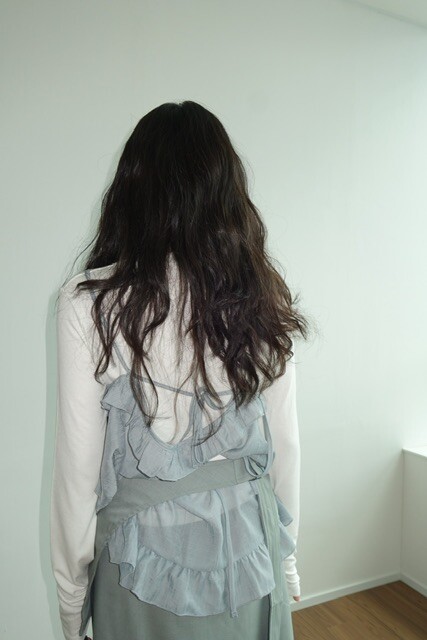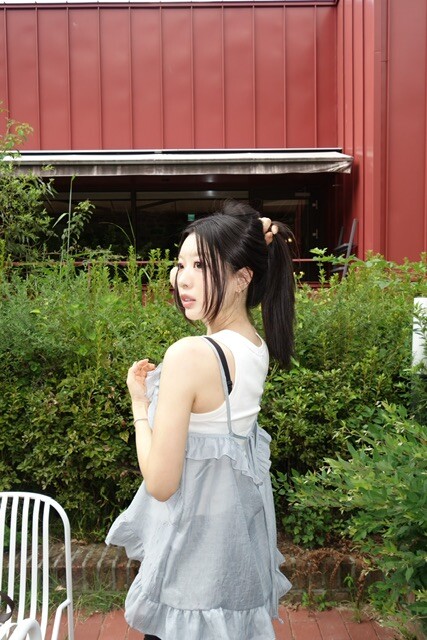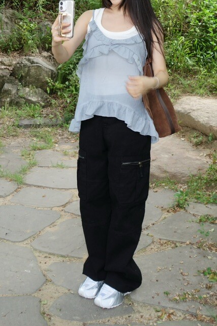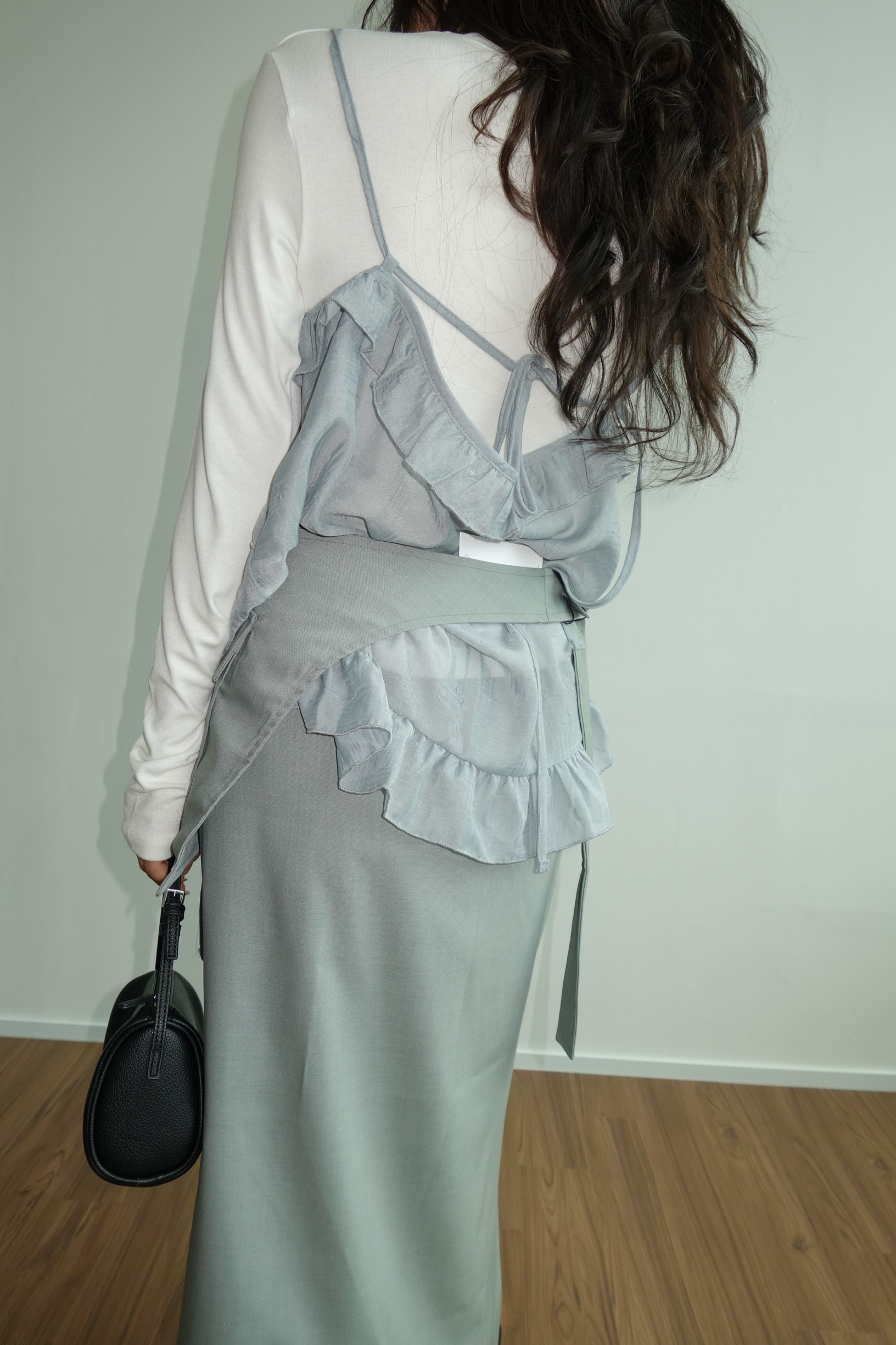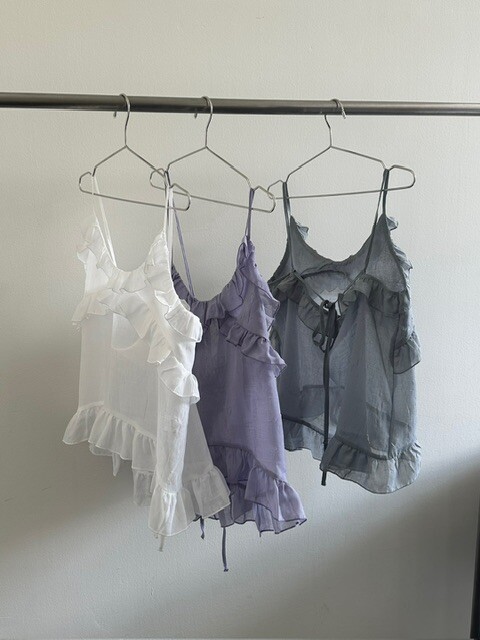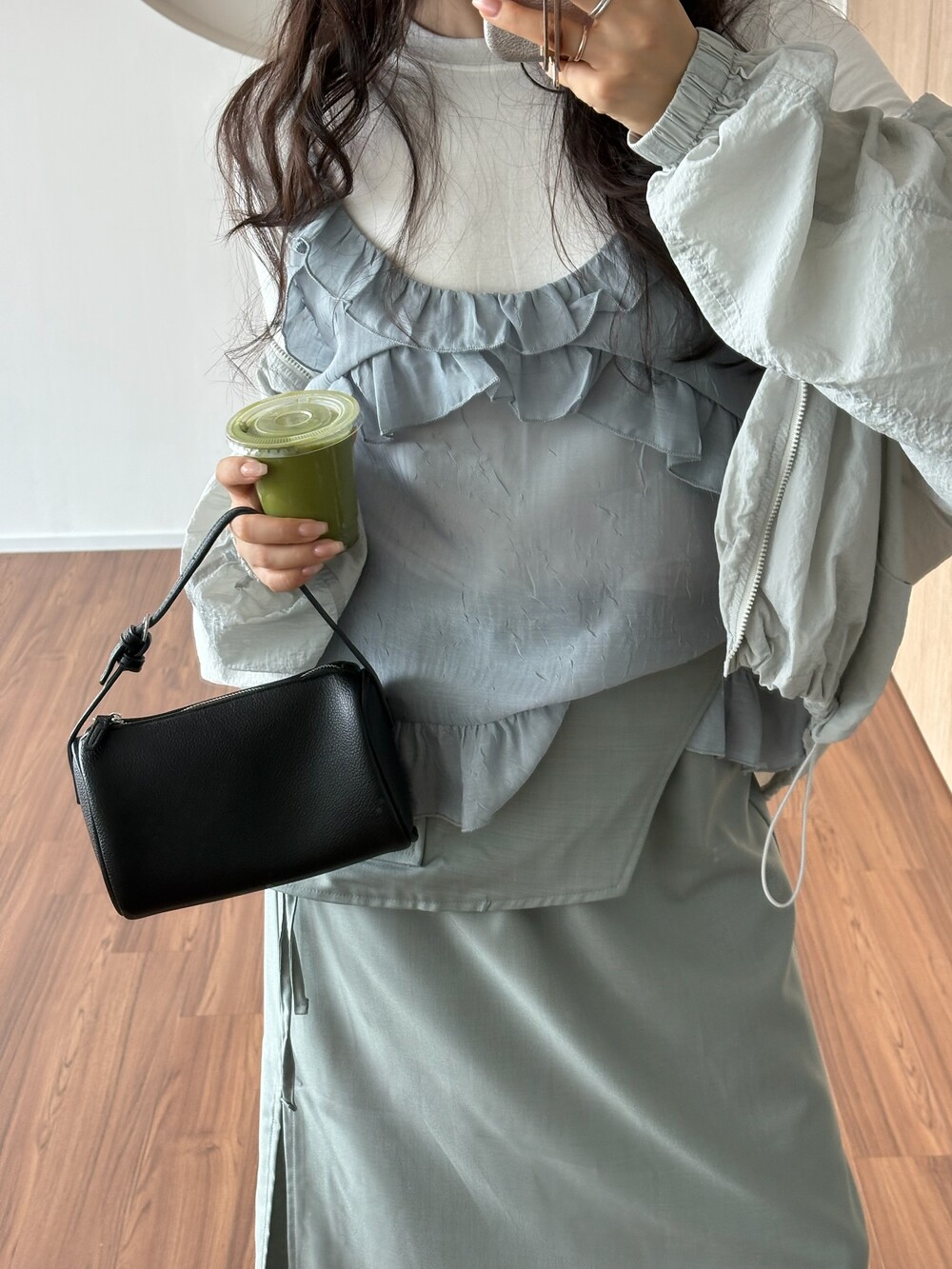 사진 속 프릴 뷔스티에는 가볍고 쉬어한 소재감이 눈에 띄는 아이템이에요.