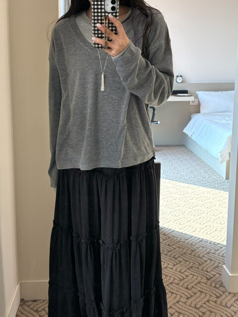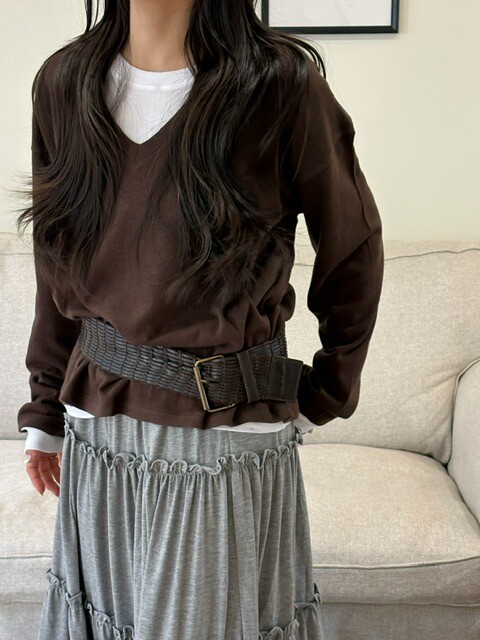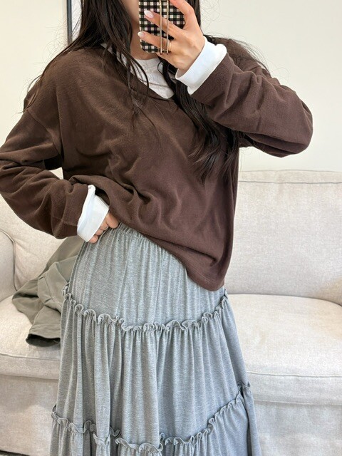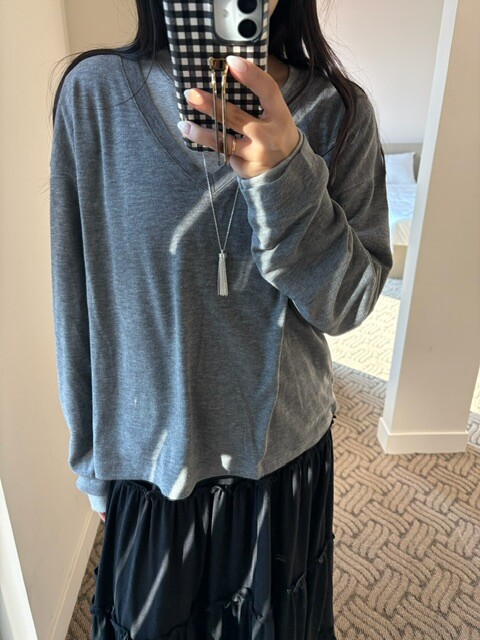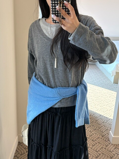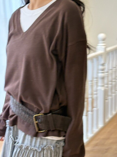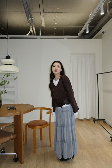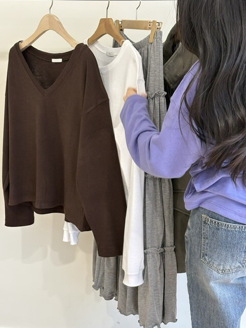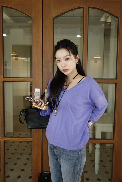 깊지 않은 브이넥 라인이 쇄골과 넥 라인을 여리하게 드러내주며, 여유 있는 루즈핏 실루엣으로 체형에 부담 없이 착용됩니다. 부드럽고 가벼운 소재감으로 단독은 물론 레이어드용으로도 활용하기 좋고, 소매와 밑단은 자연스럽게 떨어져 내추럴한 무드를 더해줘요. 그레이·브라운·퍼플·네이비까지 차분하면서도 포인트 되는 컬러 구성으로 데님, 슬랙스, 스커트 어디에나 매치가 쉬워 데일리로 손이 자주 가는 아이템입니다. 벨트나 액세서리와 함께 연출하면 한층 더 스타일리시한 룩을 완성할 수 있어요.