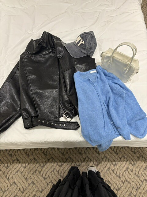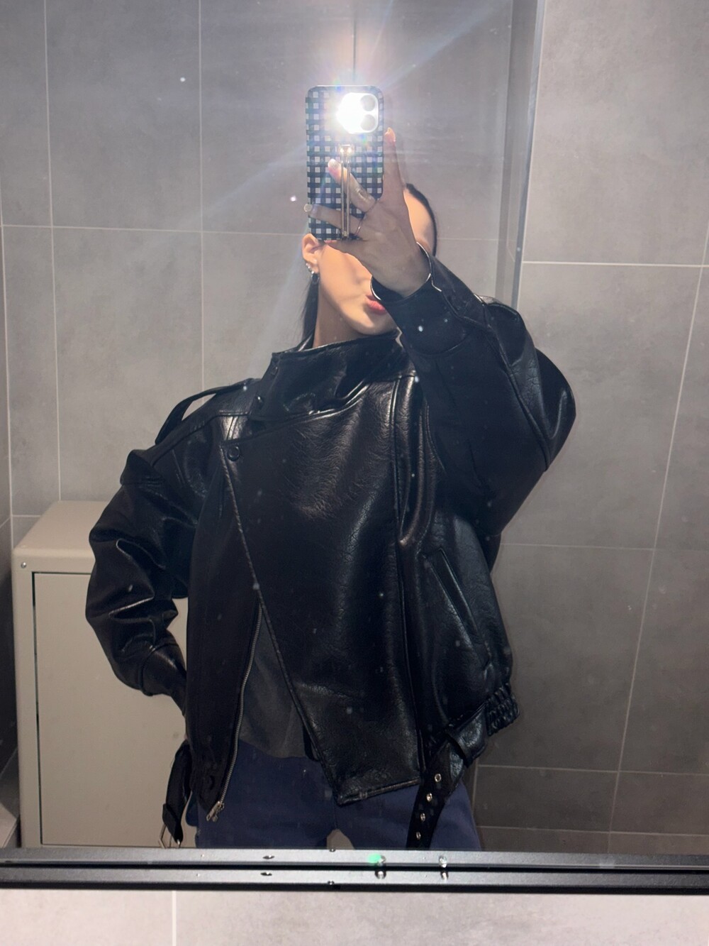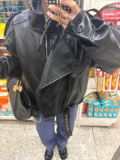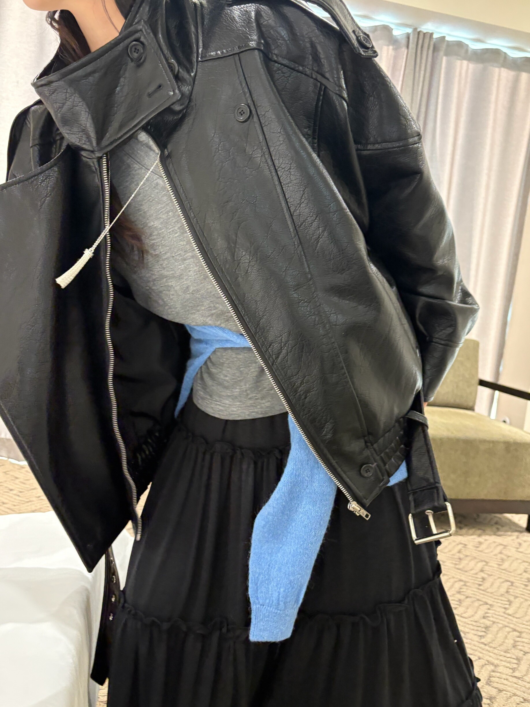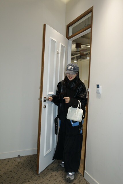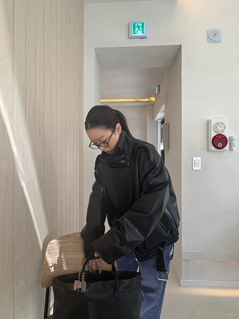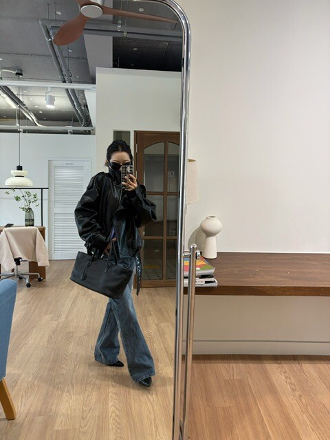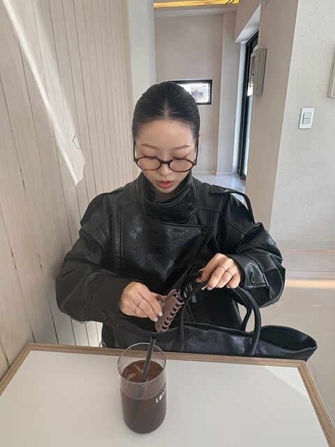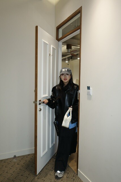 매트한 블랙 레더 텍스처가 룩에 깊이감을 더해줍니다.