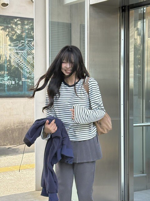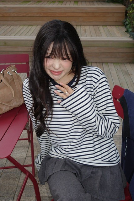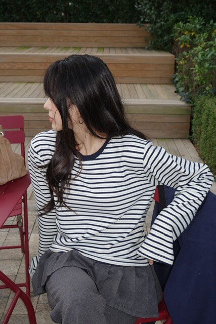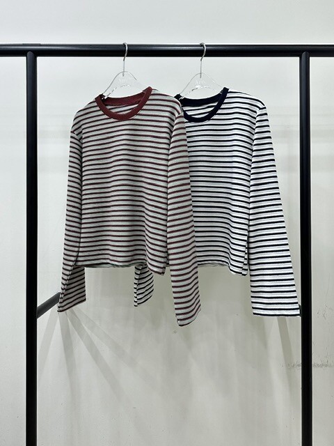 부드러운 소재감과 유니크한 배색 조합으로 단순한 스트라이프를 넘어 특별함을 느끼게 해주는 티셔츠,