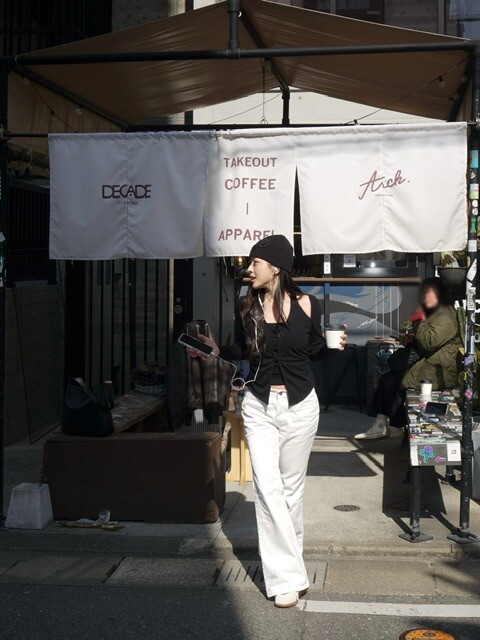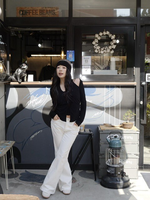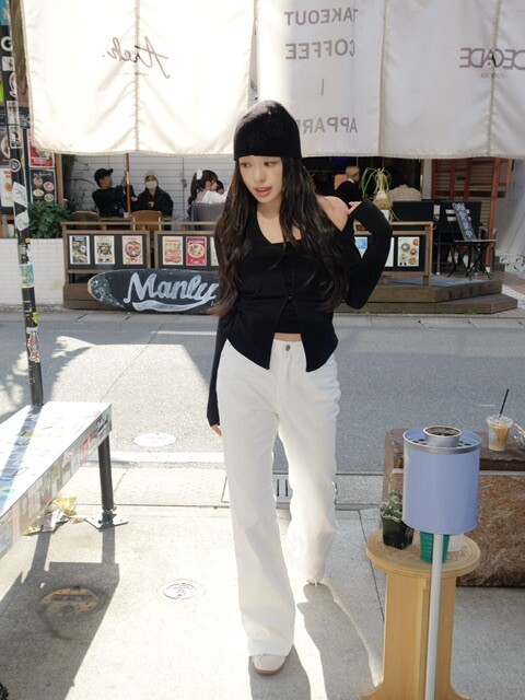 팬츠는 골반에 자연스럽게 걸쳐 입는 미드로우라이즈 핏이라요즘 많이 찾는 분위기의 데님이에요.
