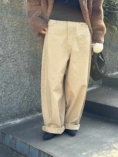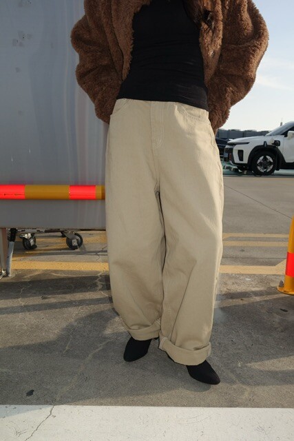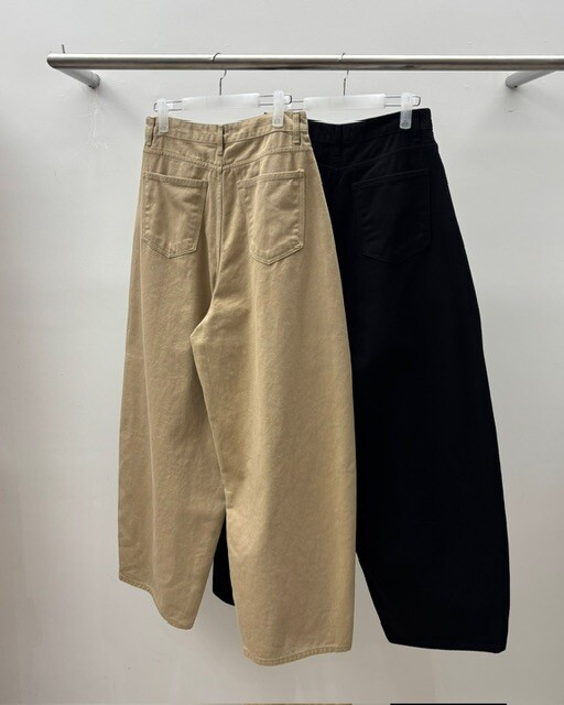 자연스럽게 휘어진 라인이 힙부터 밑단까지 여유롭게 떨어지면서, 다리 라인을 부드럽게 감싸주고 체형을 자연스럽게 커버해 줍니다
